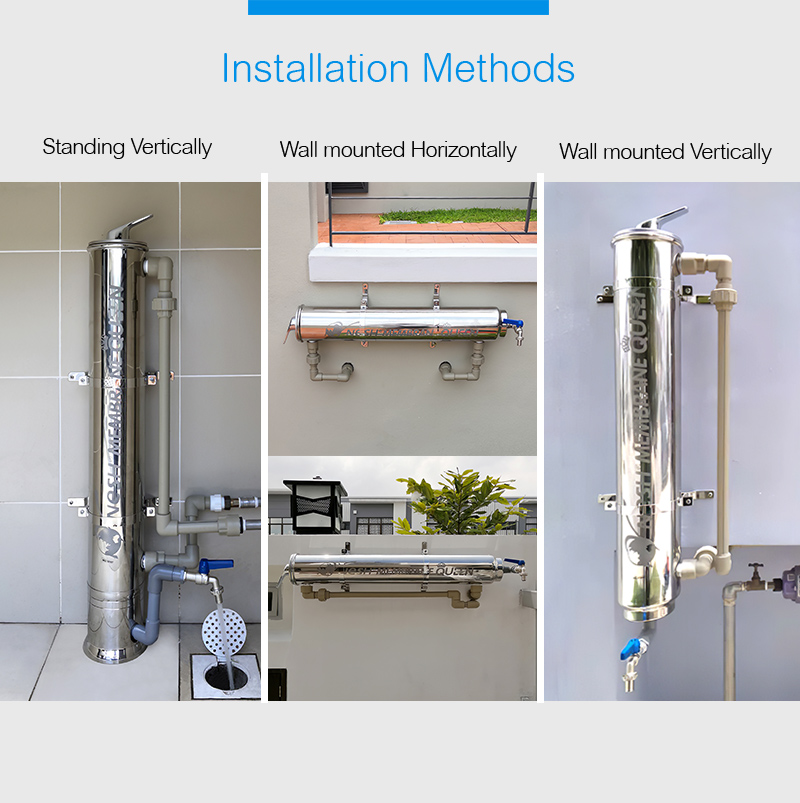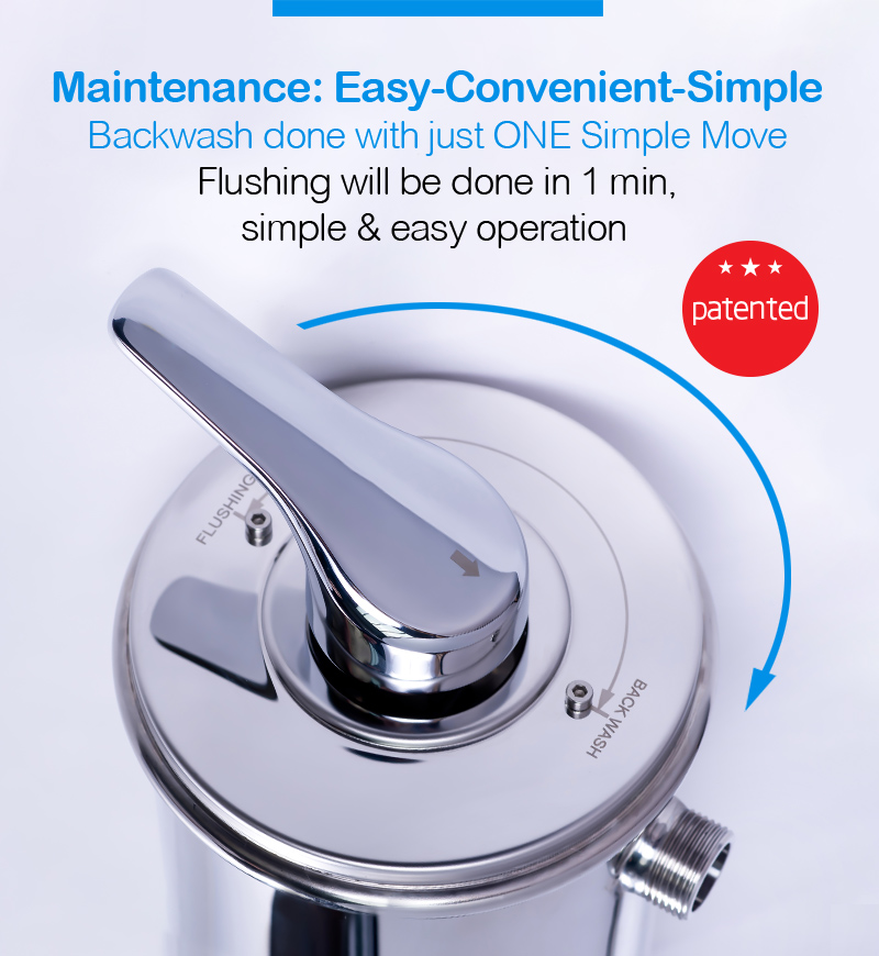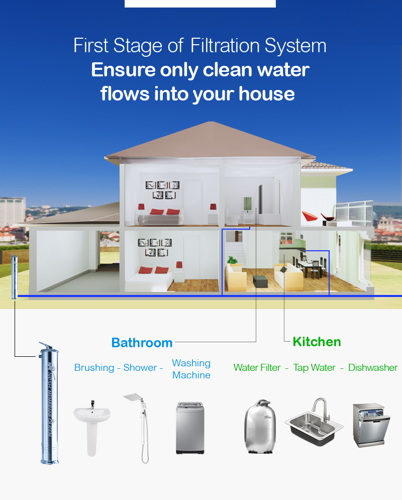 Impurities in the tap water are effectively blocked at the main water supply pipe before water entering the house. It removes bacteria, metal rust, heavy metal, mud and other residues derived from the recontamination of tap water during its journey through the water supply pipes before reaching our house water taps.