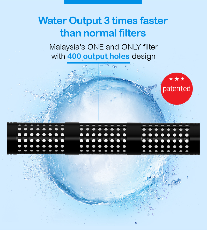 Through scientific research and development, NESH has improved and developed our membrane from the first generation in year 2004 to the patented third generation membrane launched in year 2018. It is the first and only membrane in the market with 400 output holes that grants faster and smoother water flow without affecting the water pressure of the house. So that you can use water happily with peace of mind at home.