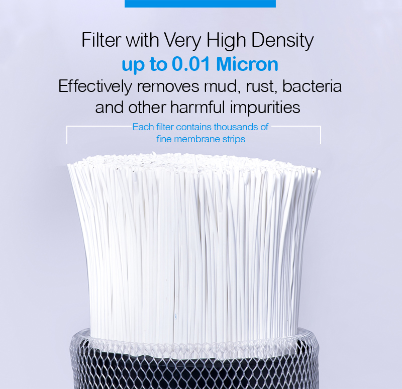 The size of each membrane hollow fibre is 0.01 micron, which is 10,000 times thinner than a human hair. It can filter out anything that is bigger than 0.01 micron such as hepatitis A virus or calicivirus that is 0.025 micron in size. It can handle dirty water which is 100 times dirtier than average tap water.