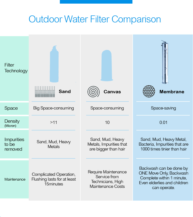 The function of membrane simulates our human body cells. Each individual membrane is high in density, therefore it is able to absorb, purify, separate and filter. Various industries like brewery, distillery, and textile have applied this technology in their production. Today, this matured membrane technology has been introduced into our household and further developed into highly effective outdoor filtration system.