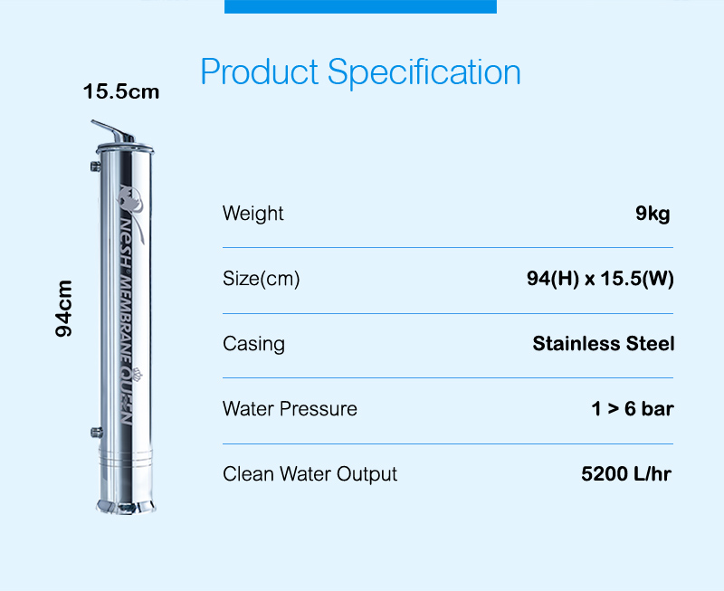 It was proven through a series of SIRIM tests that the revolutionary NESH membrane is able to filter out 99.99% of residues like mud, sand, metal rust, heavy metal, hair and etc. The performance of this amazing technology is not achievable by conventional water filtration systems.