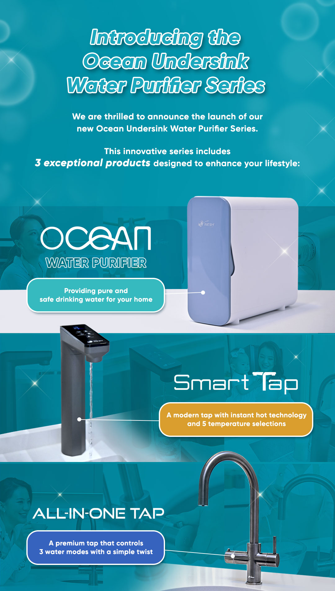 Local and overseas lab tests showed that Nesh Life Water Filtration System is able to filter 99.95% of bacteria and chemical residues in the tap water.