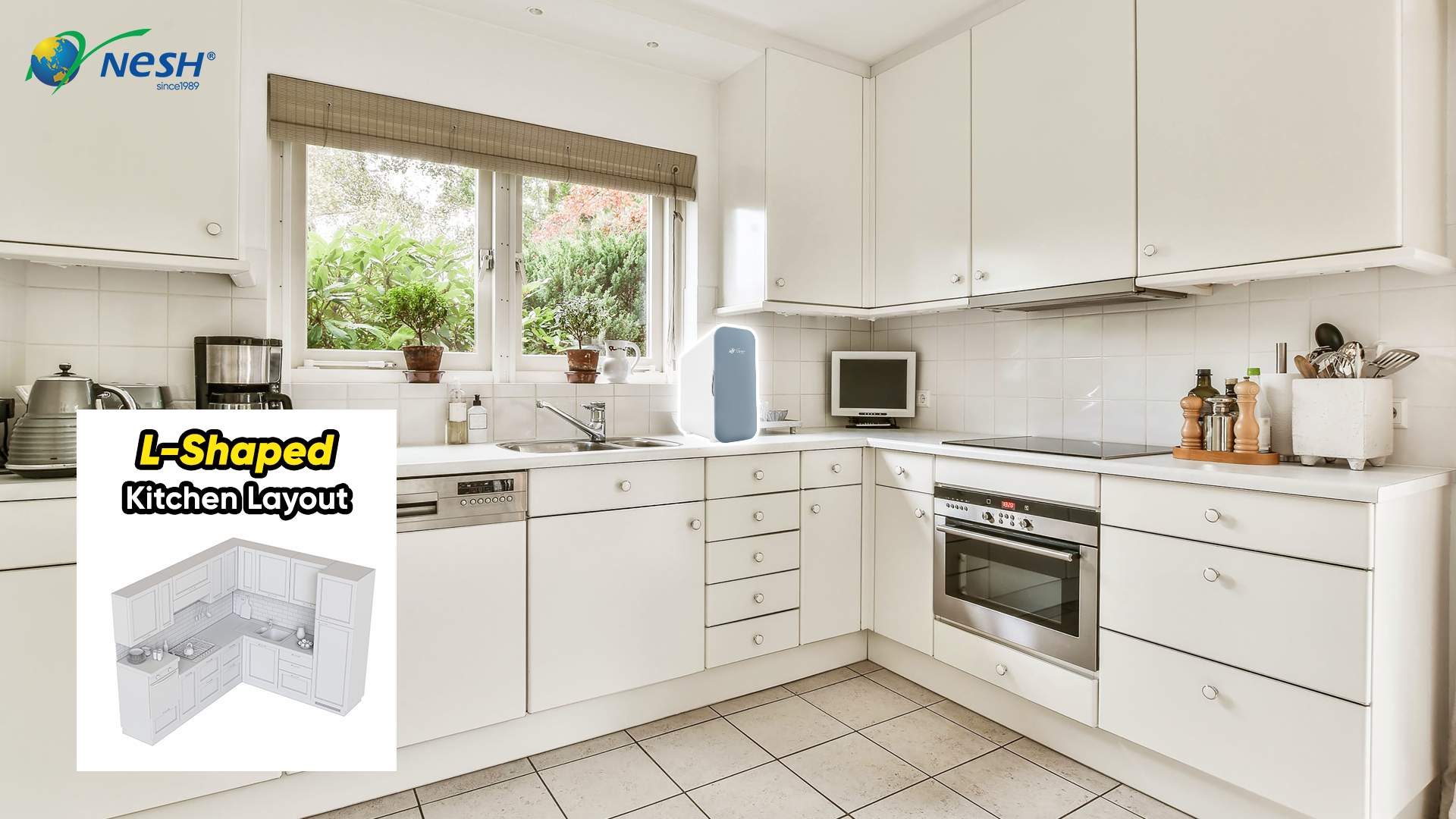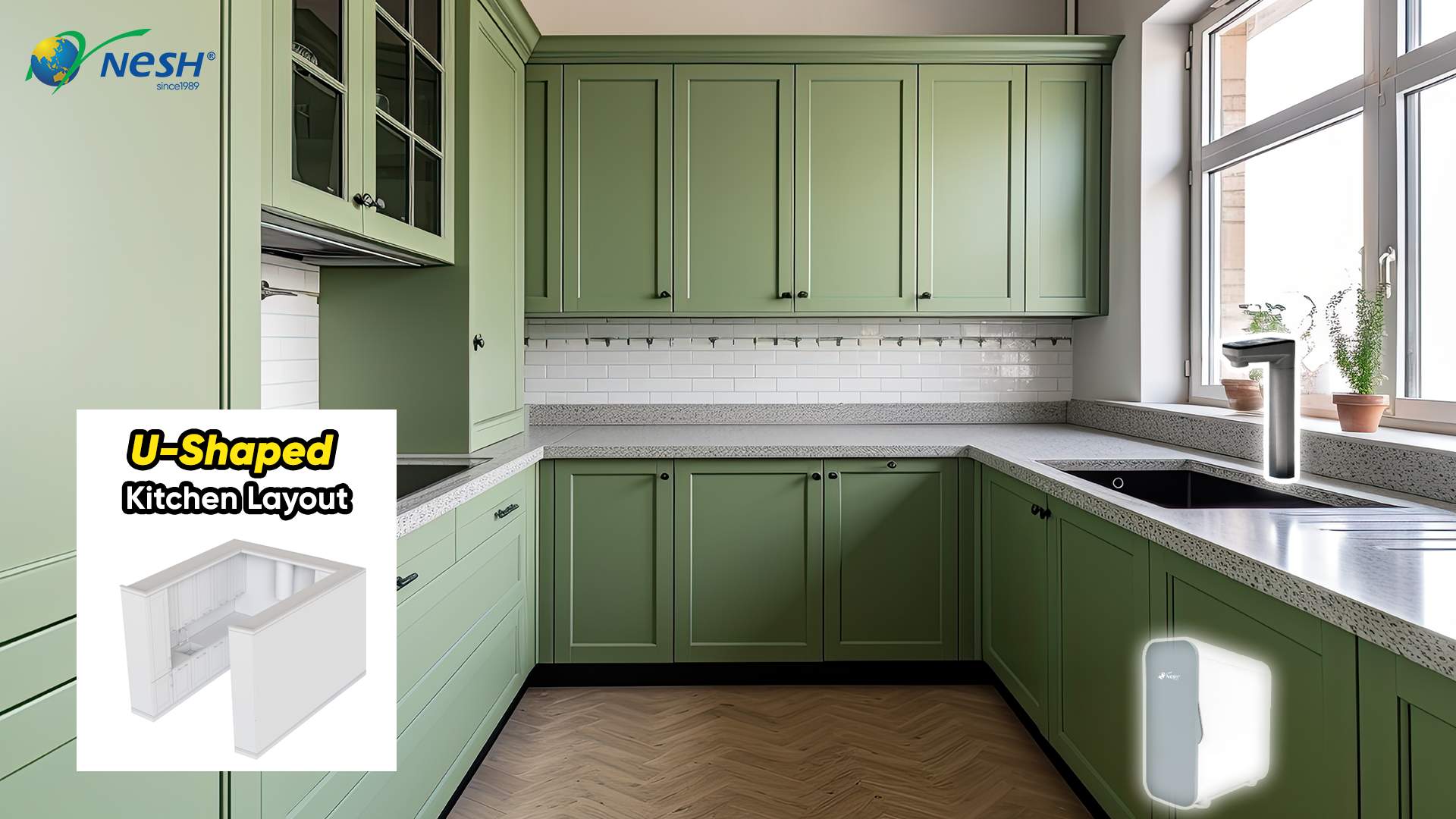 L-shaped kitchens generally have ample countertop space, utilizing two adjacent walls to form an L-shaped work area. This layout is highly efficient and convenient. We recommend placing the NESH Ocean Water Filter directly on the countertop. This installation method is quick and easy, requiring no extra drilling or plumbing modifications, making it ideal for those who don’t want to disrupt the overall kitchen design.