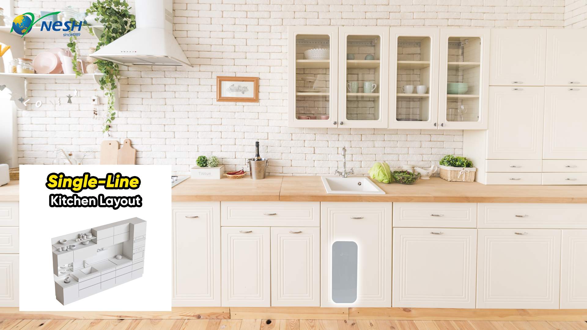 Single-line kitchen layouts are very common, with all worktops, hobs and sinks arranged in a straight line for a compact space, so you will have minimal space to place with. Therefore, installing the NESH Ocean Water Filter underneath the countertop will be a good choice. By doing do, your countertop remains untouched, making good use of the space underneath.