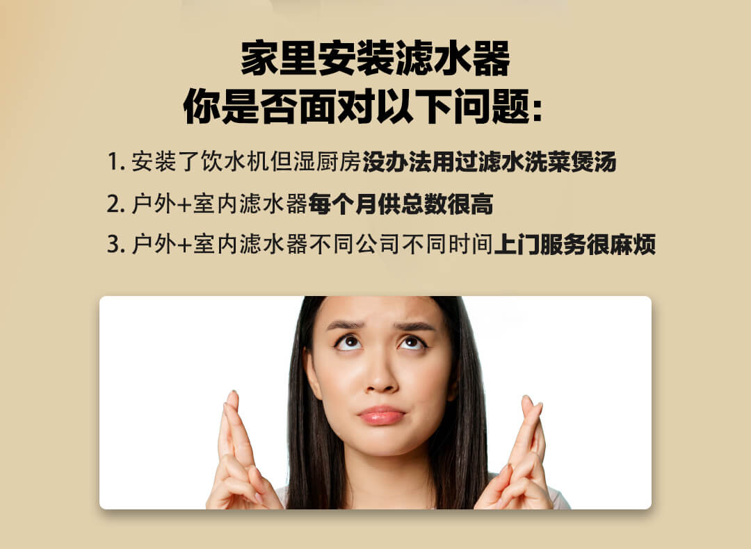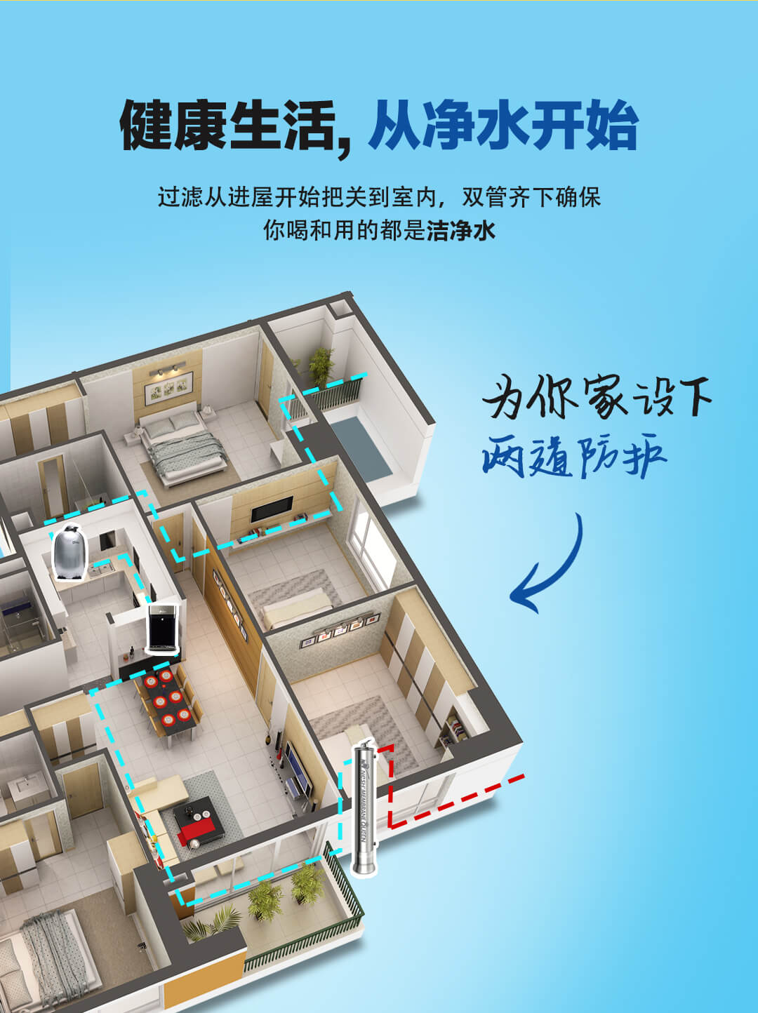 Impurities in the tap water are effectively blocked at the main water supply pipe before water entering the house. It removes bacteria, metal rust, heavy metal, mud and other residues derived from the recontamination of tap water during its journey through the water supply pipes before reaching our house water taps.
