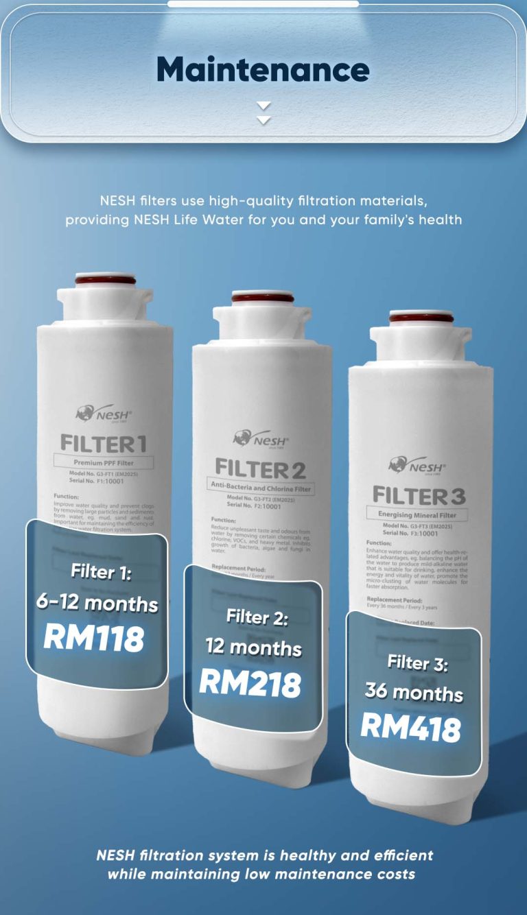 NESH Life Water Filtration System transforms normal tap water into health-enhancing quality water. Its 12 layers of filtration technology is able to effectively dissolve and filter harmful residues in our tap water.