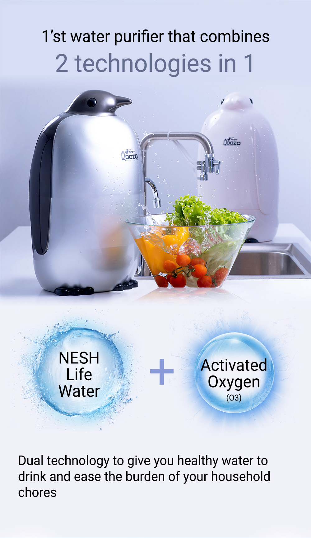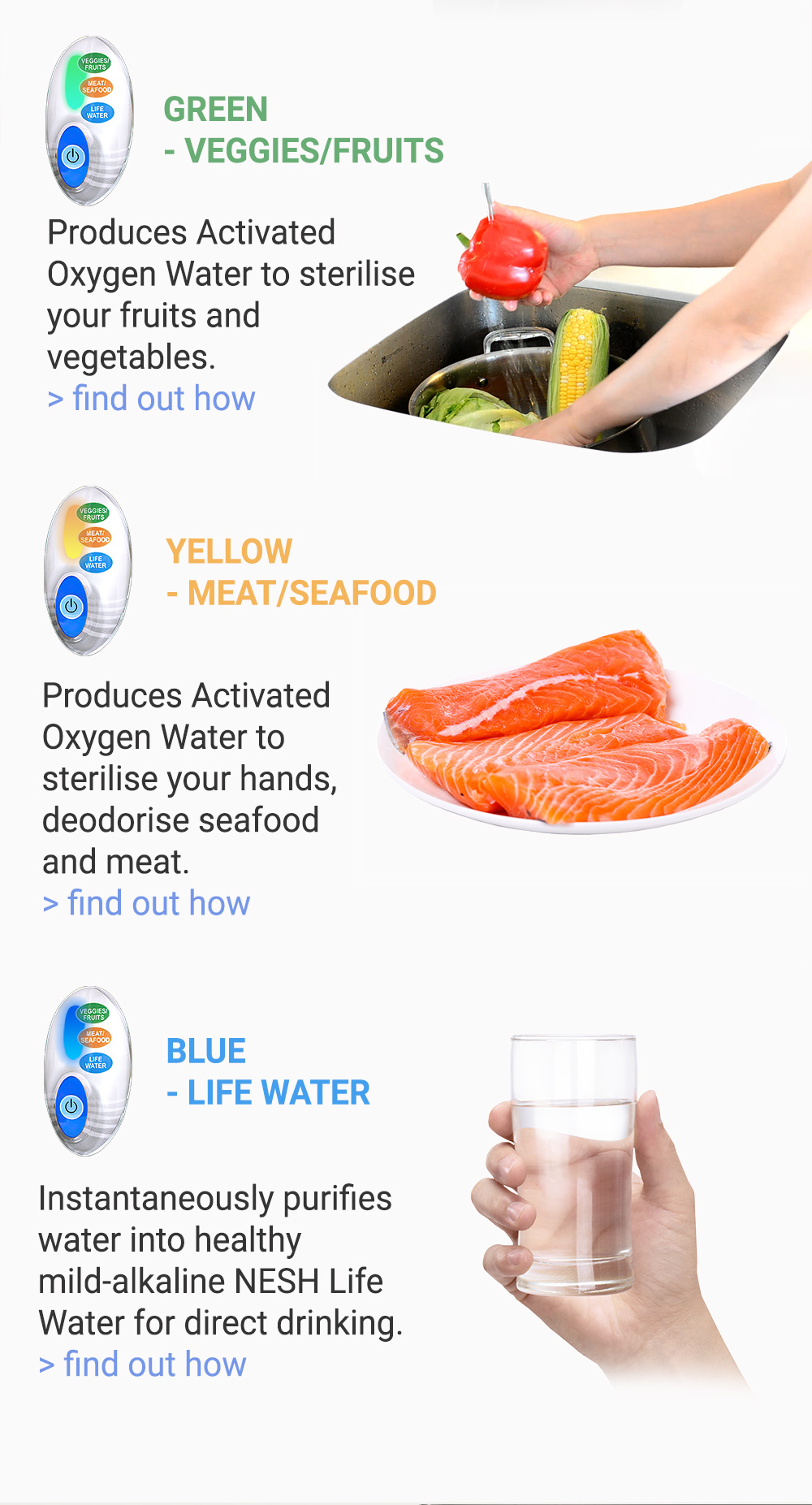 Turn on the tap, Activated Oxygen Water is produced when Nesh Life Water infused with Activated Oxygen. Use the Activated Oxygen Water to wash your hands, soak your seafood and meat, or sterilise your kitchenware and baby products.