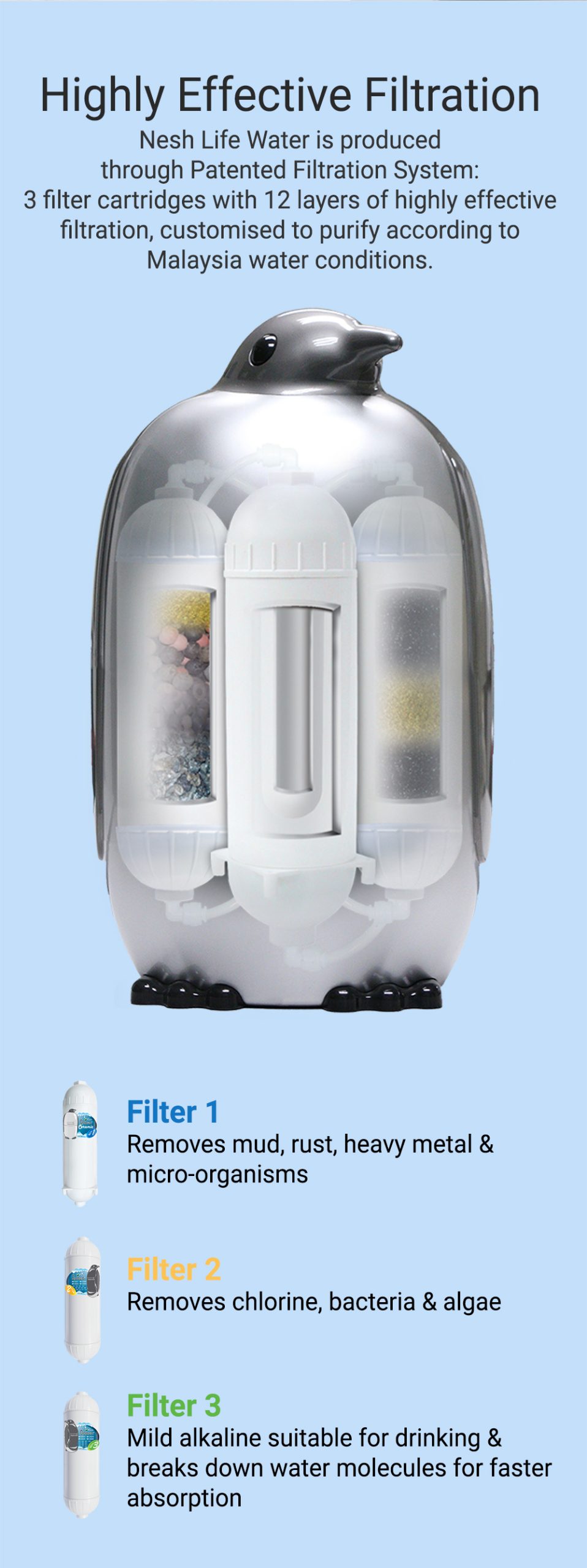 NESH Life Water Filtration System transforms normal tap water into health-enhancing quality water. Its 12 layers of filtration technology is able to effectively dissolve and filter harmful residues in our tap water.